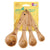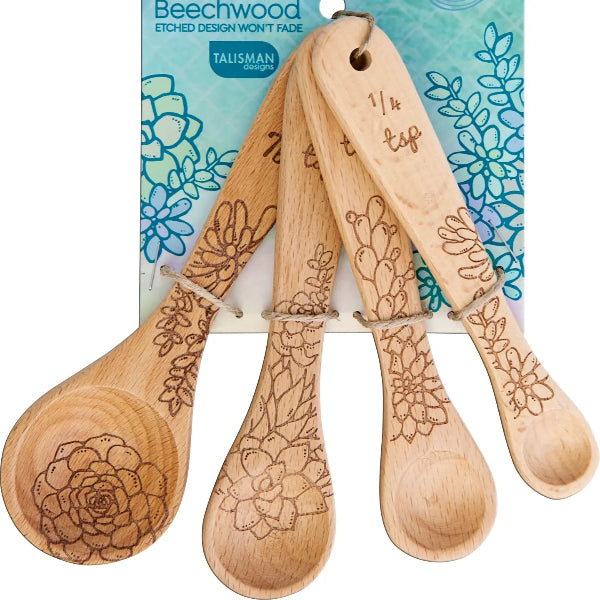 This set of 4 measuring spoons is made of all natural beechwood, the design is laser etched into wood and will not fade. Set includes 1 tablespoon, 1 teaspoon, 1/2 teaspoon, and 1/4 teaspoon. Durable and long lasting; natural oil finish; hand wash recommended.