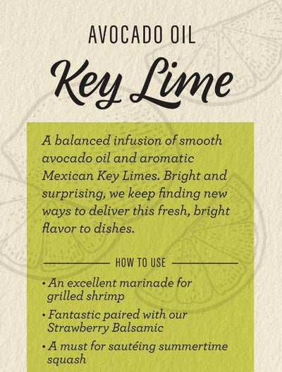 Key Lime Avocado Oil is made through a process of cold-pressing key lime zest and juice together with avocados. The avocados and citrus fruit are carefully selected and then cold-pressed to extract the oil, preserving the natural flavors. Key Lime Avocado Oil boasts bright and lively citrusy flavor - perfect for adding twist of lime to so many dishes.
