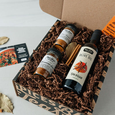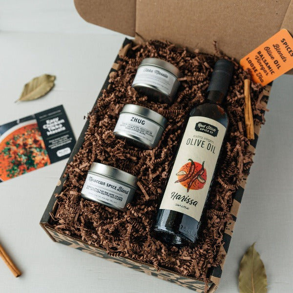 Give the gift of flavor with our Harissa Extra Virgin Olive Oil & Spice Blend Gift Boxes. Our staff curates each box and expertly pairs hand-blended spice blends to compliment the oil. Popular spice blend choices for Harissa Extra Virgin Oil include Moroccan Blend, Tikka Masala, Red Stick Spice Company House Blend, 18 Spice Chicken and more. Rest assured, these gift boxes make mealtime possibilities limitless.