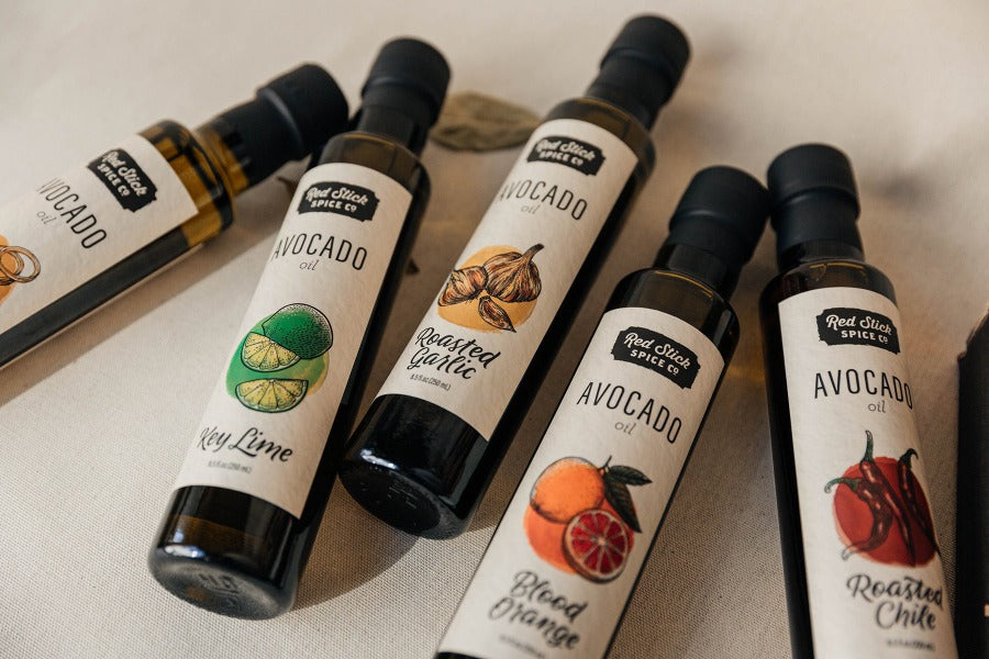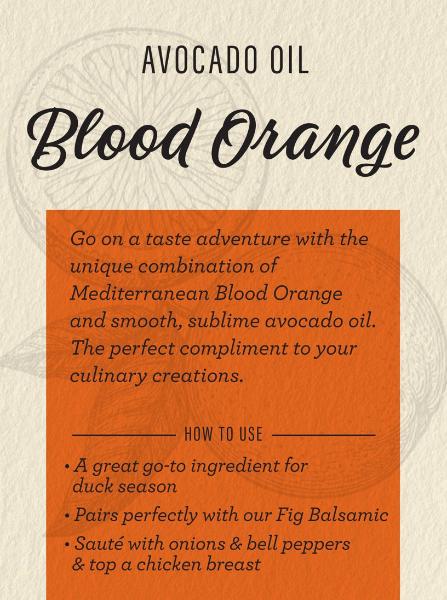 Blood Orange Avocado Oil is made through a process of cold-pressing ripe avocados together with blood oranges. The avocados and blood oranges are carefully selected and then cold-pressed to extract the oil, preserving the natural flavors. Blood Orange Avocado Oil has a vibrant orange hue and a bright citrusy flavor - perfect for adding a citrus twist to so many dishes.