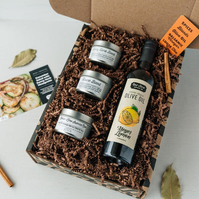 Give the gift of flavor with our Meyer Lemon Extra Virgin Olive Oil & Spice Blend Gift Boxes. Our staff curates each box and expertly pairs hand-blended spice blends to compliment the oil. Popular spice blend choices for Meyer Lemon Extra Virgin Oil include Lemon Lime Salmon Rub, Lemon Pepper, Garlic & Herb Blend and more. Rest assured, these gift boxes make mealtime possibilities limitless.