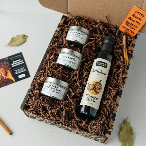 Give the gift of flavor with our Avocado Oil & Grilling Spice Blend Gift Box. Our staff curates each box and expertly pairs hand-blended spice blends to compliment the oil. Popular spice blend choices for grilling with Avocado Oil include Sweet Pecan Rub, Coffee BBQ Rub, Big Daddy's Smokehouse, Nashville Hot Chicken and more.