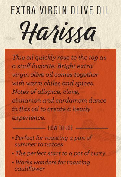 Harissa Extra Virgin Olive Oil is made by infusing Maghreb hot chiles, allspice, clove, cinnamon and aromatics into olive oil. Chiles and spices are at play here in this intensely complex oil. We love Harissa Extra Virgin Olive Oil for sautéing chicken or shrimp. This one is a must for drizzling on roasted cauliflower and a platter of hummus.