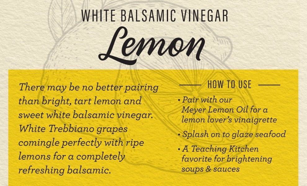 Dive into the tangy and sweet flavors of our Lemon White Balsamic Vinegar. Made with real lemon and tart-sweet white balsamic, this versatile white balsamic vinegar adds a refreshing zing to any dish. Elevate, lighten and brighten your salads, marinades and sauces with this delicious blend. We love this one on chicken, over salads and as a bright splash to a cole slaw!