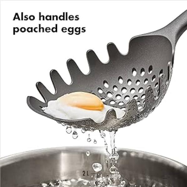 The long, comfortable, ergonomic handle and carefully shaped head gives you good reach in pots big or small. Dishwasher safe.Features An easier way to scoop and strain long, short or delicate pasta Long handle perfect for one-handed scooping and straining Large-capacity scoop handles pasta, vegetables and poached eggs