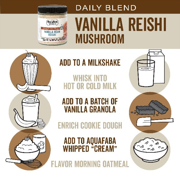 Adaptogenic Reishi Mushroom powder meets vanilla beans in this beneficial blend that's part of the Red Stick Spice exclusive line of Daily Blends. Use them on the daily for mental focus, enhanced immunity and overall feel good vibes. Delicious + Nutritious.