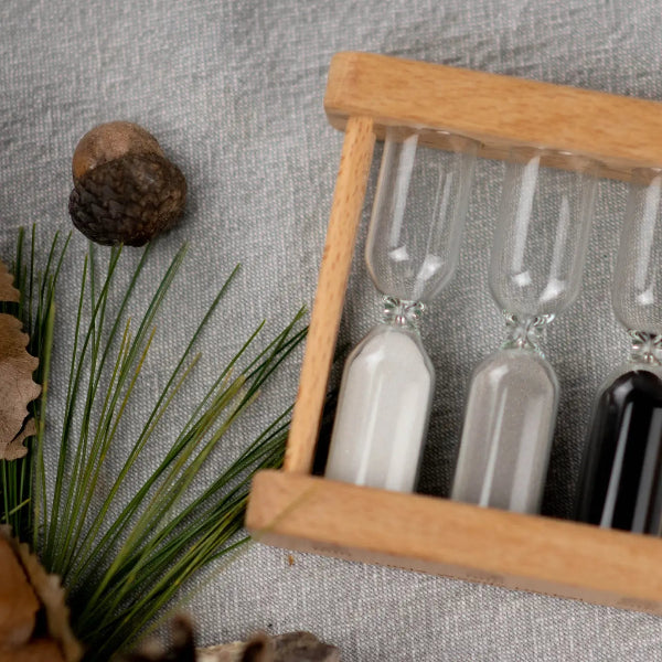Take your tea steeping to the next level with this zen styled sand tea timer. This wooden sand tea timer counts down 2 minutes for black teas, 3 minutes for green teas and oolongs, and 5 minutes for herbal teas. Made with wood, glass and sand. No plastic or metal.